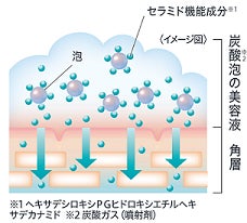 『キュレル 潤浸保湿 泡美容液』は、高吸着セラミドケア*2技術を採用しており、セラミド機能成分*7(保湿)と炭酸*3を含む濃密泡の美容液が肌の角層深くまですばやく浸透し保水します。また、乾燥によってキメの乱れた肌の奥(角層)まで浸透し潤いを与え、くすみが晴れたような明るいなめらかな肌に導きます。