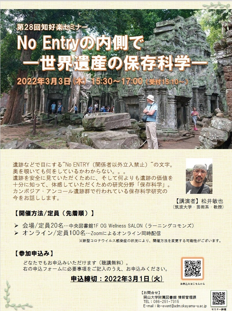【岡山大学】附属図書館第28回知好楽セミナー「No Entryの内側で ー世界遺産の保存科学ー」〔3/3,木 ハイブリッド開催〕