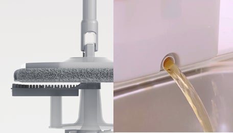 また、モップ部分は、棚やソファーの下など狭い場所もラクに掃除ができる薄型を採用。吸着性に優れたマイクロファイバー生地を使用しているため、汚れを簡単にふき取ります。その後は、バケツ内のブラシが髪の毛やゴミをかき取るので、モップからゴミを取り除く手間がかかりません。さらに、バケツ下部には排水口が付いており、汚れた水を簡単に排水できます。