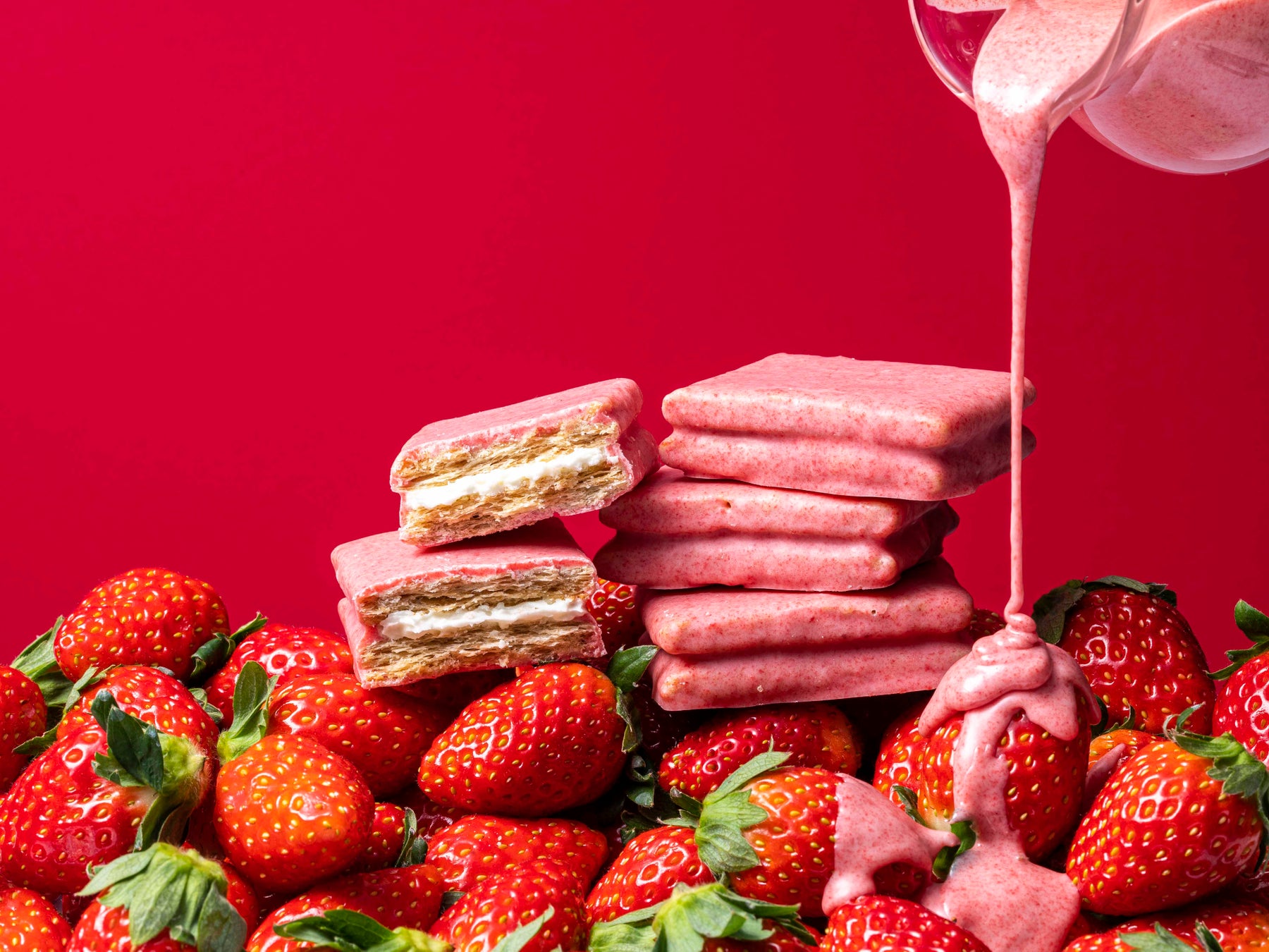 コクのあるミルククリームサンドを甘酸っぱい苺ショコラでぜいたくにコーティングしました。ジューシーないちごミルク味のシュガーバターサンドです。