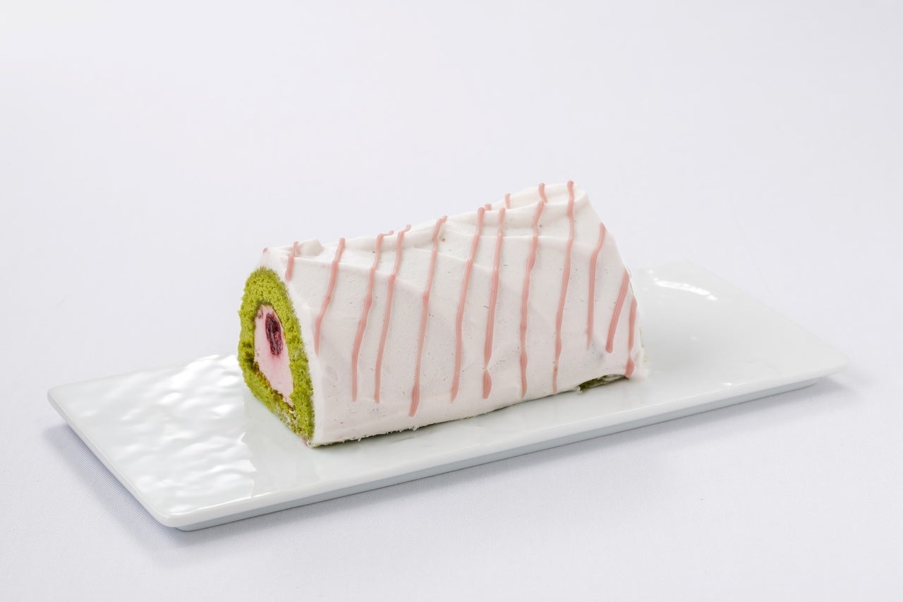 サワーチェリーのシロップ漬けが入ったレアチーズケーキを抹茶の米粉生地でつつみました。サワーチェリーのシロップ入りクリームと桜のガナッシュソースで装い、淡い桜色に仕上げています。