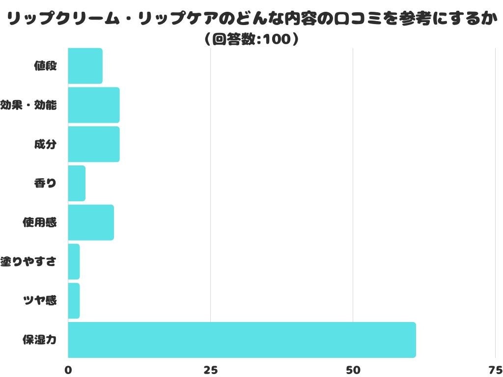 リップクリーム・リップケアのどんな内容の口コミを参考にするかをアンケートにて調査したところ、1位は「保湿力」でした。