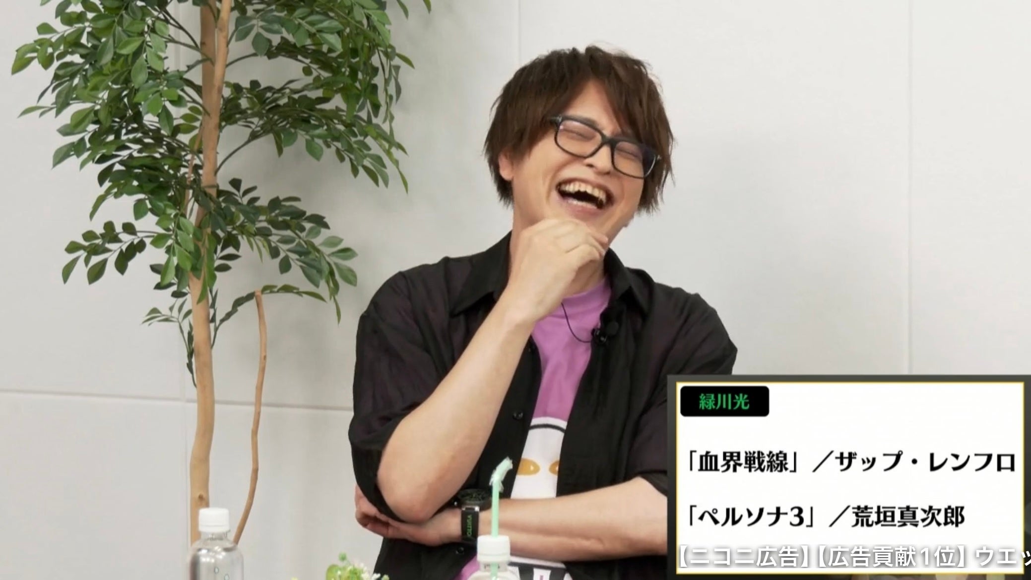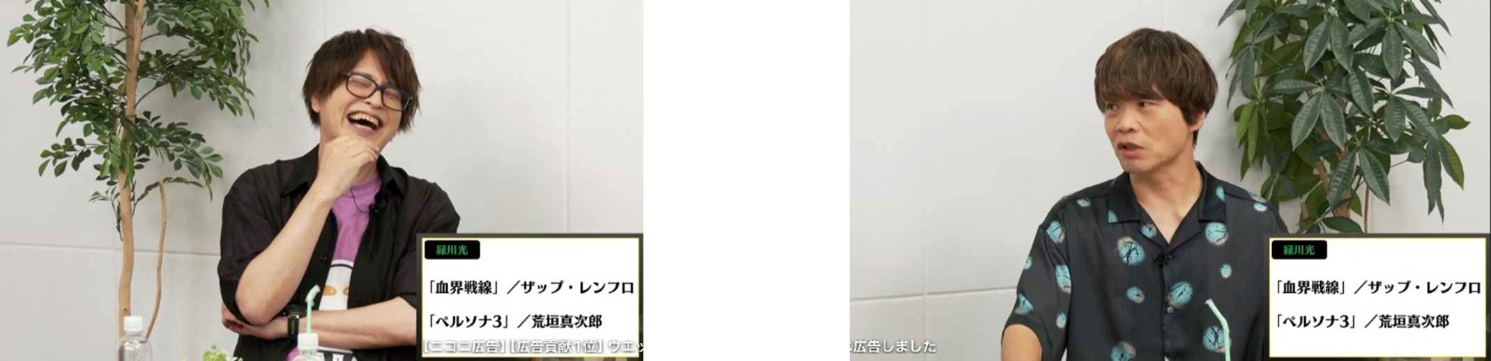 気を取り直して、まず最初の質問は「相手の演じたキャラクターで印象に残っているものは?」。緑川は「血界戦線のザップ・レンフロ、ペルソナ3の荒垣真次郎」と回答。緑川も血界戦線ではツェッド・オブライエン役、ペルソナ3では真田明彦役で出演しています。「ザップは良い意味でゲスくて、魅力的なキャラクターだよね」と語ると、「僕もとても好きなキャラクター。演じていると自分の中の悪いものを発散できる」と頷く中井。緑川が「真田を演じているとき、監督からは最初の方は声のトーンをもっと上げてって言われていた。でも劇場版ではトーンについて言われなかったな」とペルソナ収録時の思い出を振り返ると、中井は「もうトーンがどうこうって言うのではないくらい、緑川さんと真田が馴染んでいるんだと思います」と主張。後輩からの熱いコメントに、緑川も「そうかあ」と納得した様子を見せました。そんな中、中井の回答は「血界戦線のツェッド・オブライエン」で、ペルソナ3が選ばれなかったことに気付いた緑川は「ペルソナはそうでもなかった?」と中井に問いかけ、「違う!そうじゃないって!」と慌てて否定する中井の珍しい姿に、コメント欄も「あーあwww」「いじけっちゃったw」と盛り上がりました。