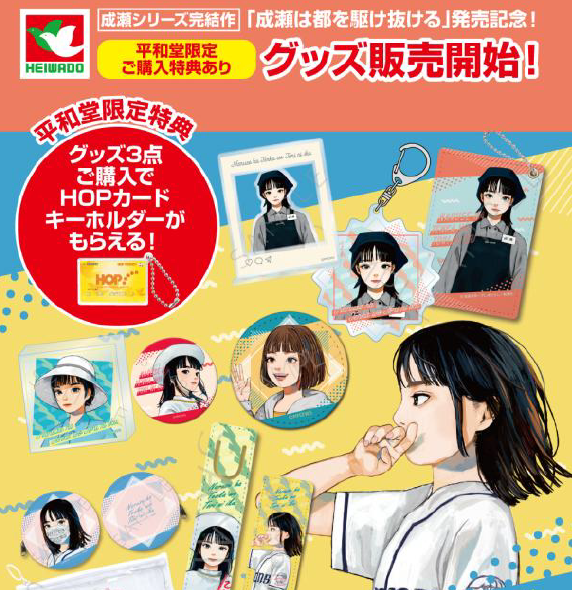 このたび完結作の発売を記念して、作品オリジナルグッズのアクリルキーホルダーやアクリルスタンド、缶バッジやパスケースなどを平和堂インターネットショップとフレンドマート大津テラス店にて販売します。1回のお会計でグッズを3点以上お買い上げの方には、平和堂オリジナルポイントカード「HOPカード」をデザインしたキーホルダーを進呈する平和堂限定特典を合計先着200名様分ご用意しております。グッズをお供に、作品の聖地巡りをお楽しみください。