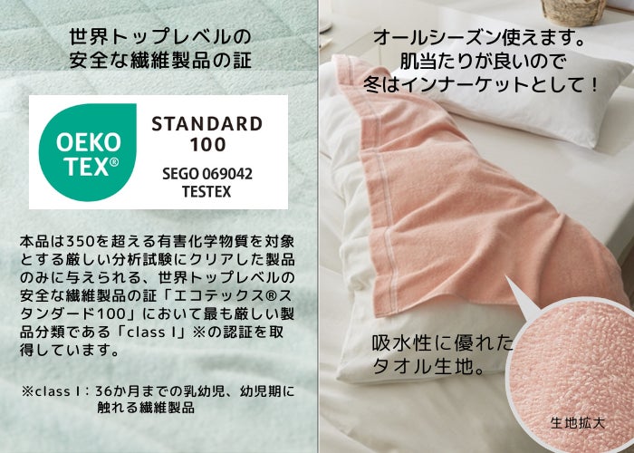 シリーズ累計販売数9.8万枚(※1)を突破した人気シリーズのクールケットです。この商品は、触れた瞬間の冷たさが気持ちいい接触冷感素材と、やわらかな吸汗速乾の綿混タオル素材のリバーシブルなので、季節や好みで使い分けができます。春から秋口まで長期間お使いいただけるのもロングセラーの理由です。