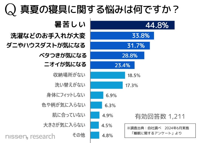 ・真夏の寝具への不満は”暑苦しい”ことが45%で最も多く、好きな手触りは、”サラっとしている”が約70%と圧倒的に人気。