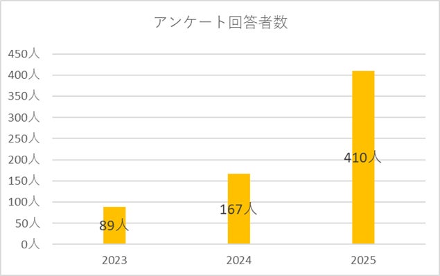 2023年より2会場・参画団体11団体でスタートした本イベントは、2024年に3会場・13団体、2025年に4会場・21団体と拡大。また、回答任意による来場者アンケートの集計数も2023年89名、2024年167名、2025年は410名と参画団体及び来場者数ともに広がりを見せています。