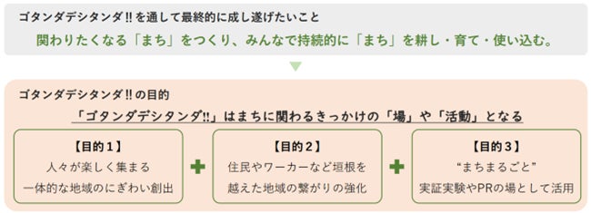 本イベントは、まちに関わるきっかけの「場」や「活動」となることで、①にぎわいの創出、②住民やワーカーなどの垣根を越えた地域のつながりの強化、③“まちまるごと”活用、の3点を目的に、多くの人が持続的に「まち」に関わることを目指す取り組みです。