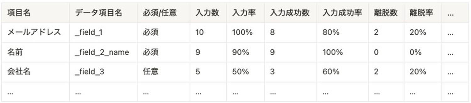 フォームの項目ごとに、離脱率や入力成功率が確認可能 |