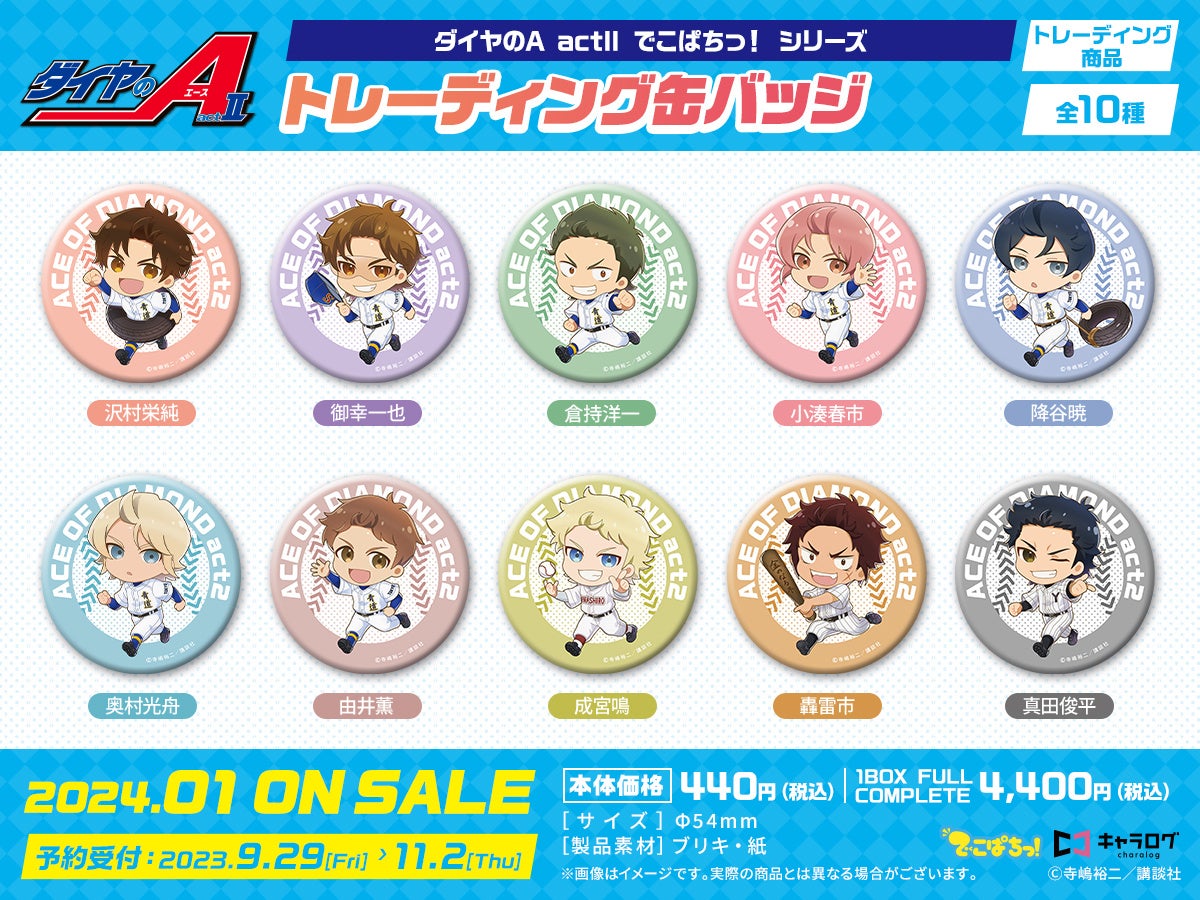 ◆「キャラログ」にて、「ダイヤのA actII トレーディング缶バッジ [でこぱちっ!]」を1BOXご予約ごとに、「予約特典缶バッジ(全2種)」をどちらかおひとつプレゼント!(※選択可)