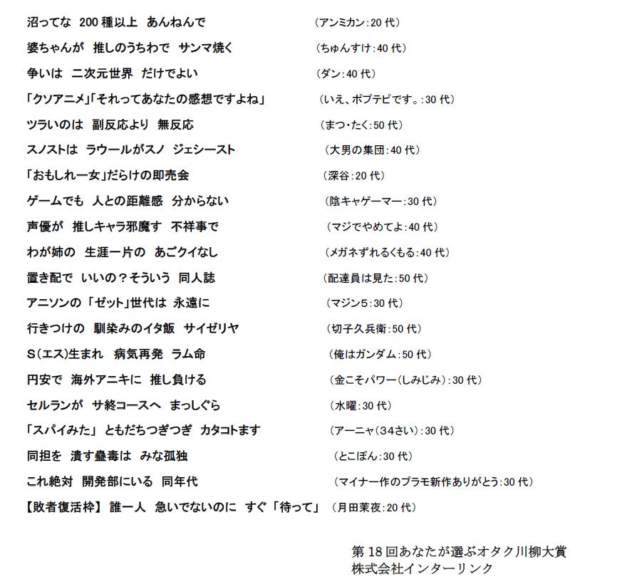 上級者向け(使う人のあまりいない)の特殊な(微妙な)サービスを提供する、インターネットサービスプロバイダーの 株式会社インターリンク(東京都豊島区、代表取締役:横山正)は、川柳コンテスト「第18回あなたが選ぶオタク川柳大賞」(以下、オタク川柳)の投票受付を開始致しました。