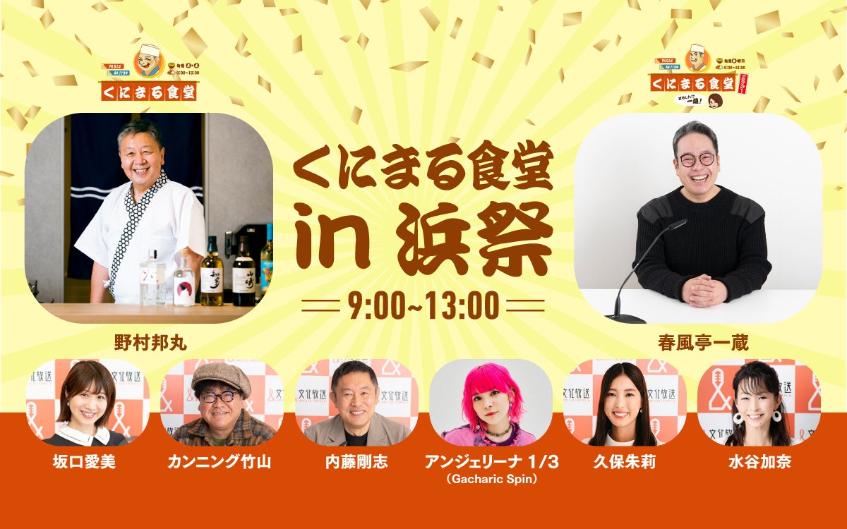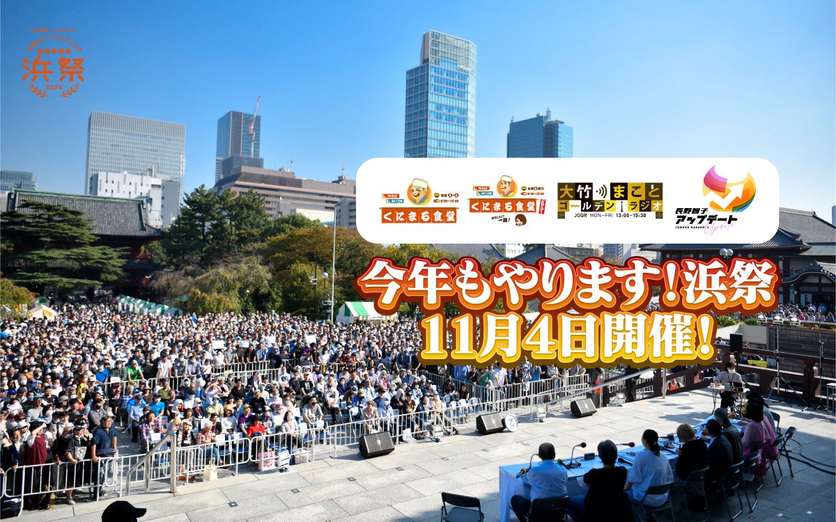 「浜祭」の当日には、増上寺大殿のメインステージにて『くにまる食堂』、『大竹まこと ゴールデンラジオ!』、『長野智子アップデート』3番組の公開生放送を行います。このほど決定した出演者、およびそのほかの企画は以下のとおりです。(※9月17日現在で決定している内容です)