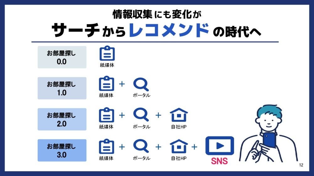 そして現代は、SNS上でレコメンドされた物件情報・動画を見るようになっています。これを「お部屋探し3.0時代」と呼んでいます。