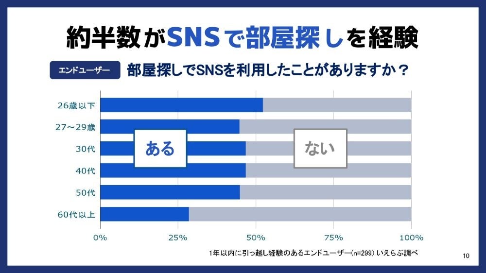 現在、部屋探しの中心はSNSになってきています。「SNSでお部屋探しをしたことがありますか?」というアンケートをとったところ、26歳以下の方は半数以上がSNSを通じて部屋を探しているという結果が出ました。テレビを見ることが少なくなっていて、SNSの利用はテレビ視聴時間の3~4倍(※)になっています。SNSを活用することで、テレビよりも認知度を上げることができると言えます。