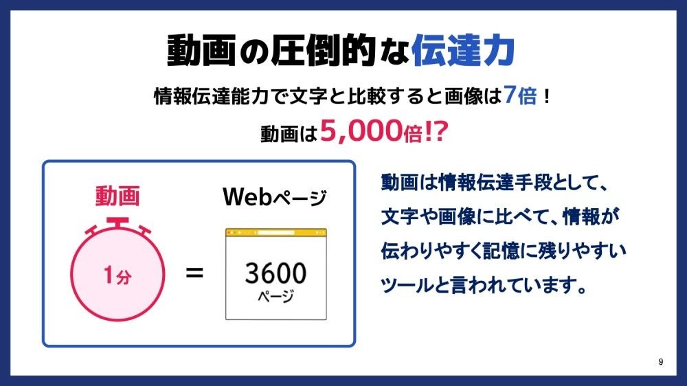 動画の情報伝達力は圧倒的で、動画1分で人間に伝わる情報量はWebページ3600ページ相当とも言われています。不動産業界でも、動画は必須になっていくコンテンツです。