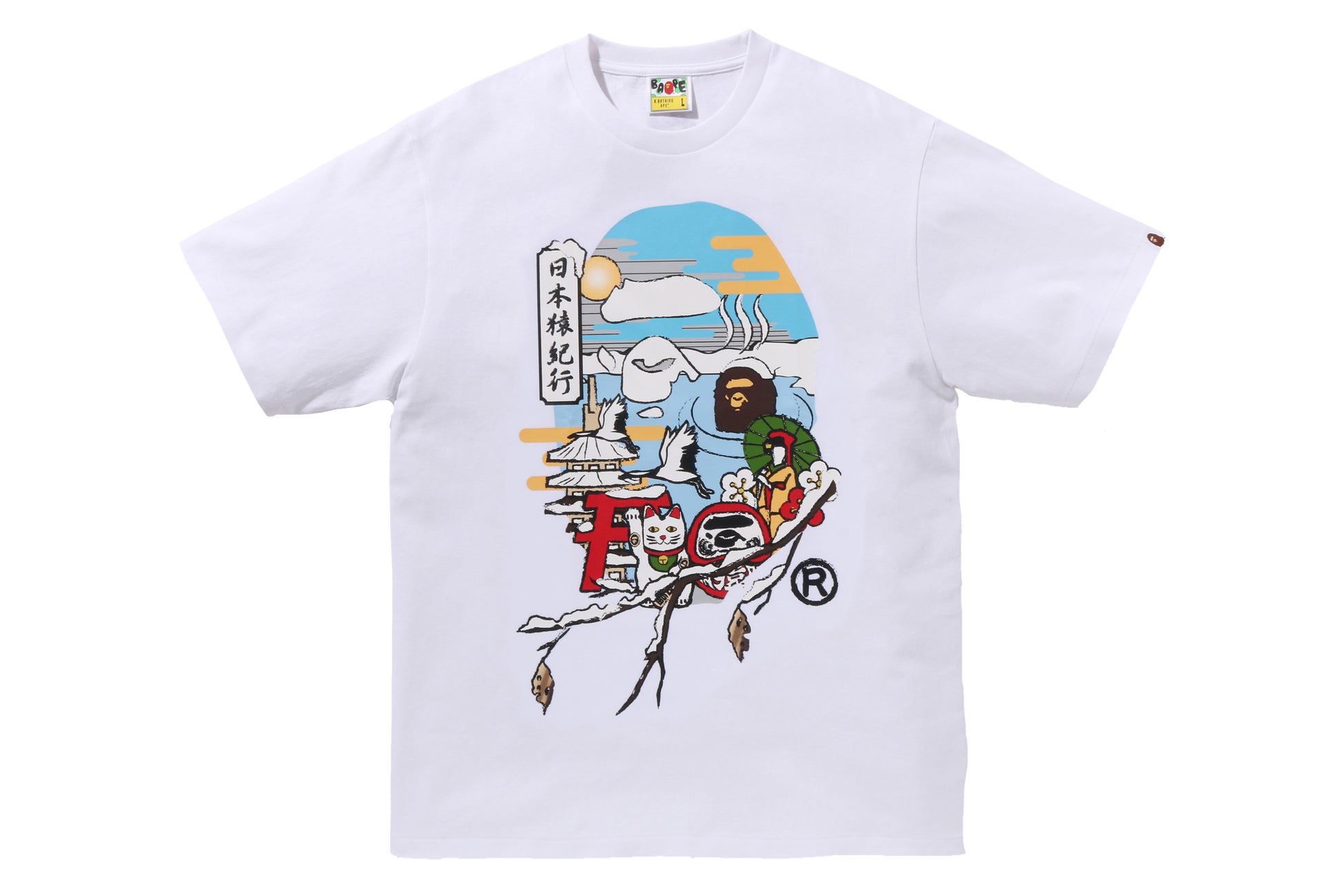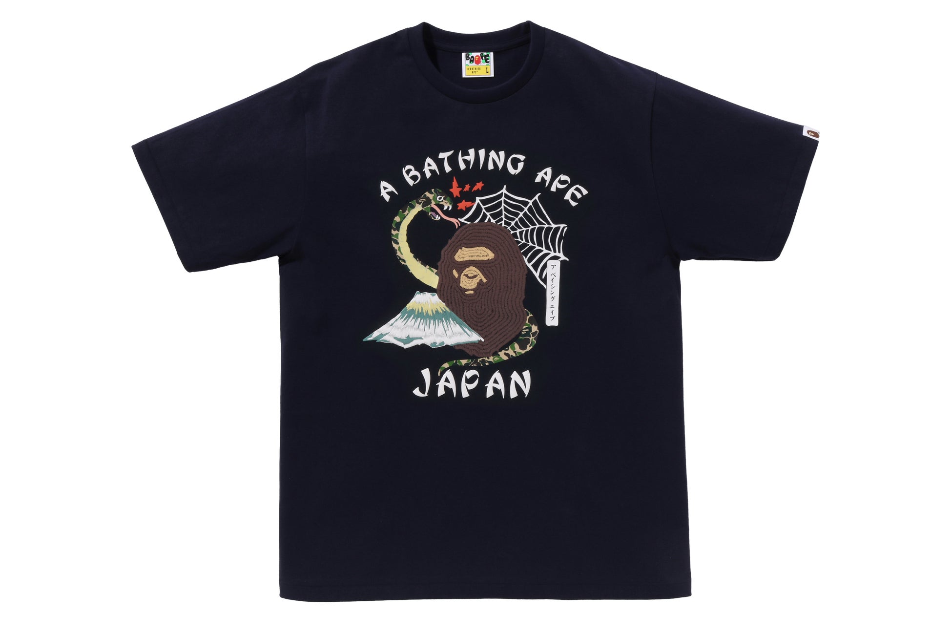 魔除けや武運の象徴として古く日本で親しまれている”三つ巴”モチーフにAPE FACEを重ねたデザインや、スカジャンに見られるような華やかなグラフィックなど、様々なパターンのTシャツがラインアップ。