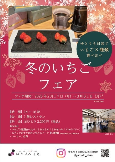 “想いをつむぎ、新しさでつなぐ”「Relo Hotels&Resorts(リロホテルズ&リゾーツ)」の温泉旅館「ゆとりろ日光」(所在地:〒321-1661 栃木県日光市中宮祠2484)は、栃木のブランドいちご「とちおとめ」「とちあいか」「スカイベリー」の3種の食べ比べやいちごスイーツなどが愉しめる<冬のいちごフェア>を2025年2月17日~3月31日まで開催いたします。