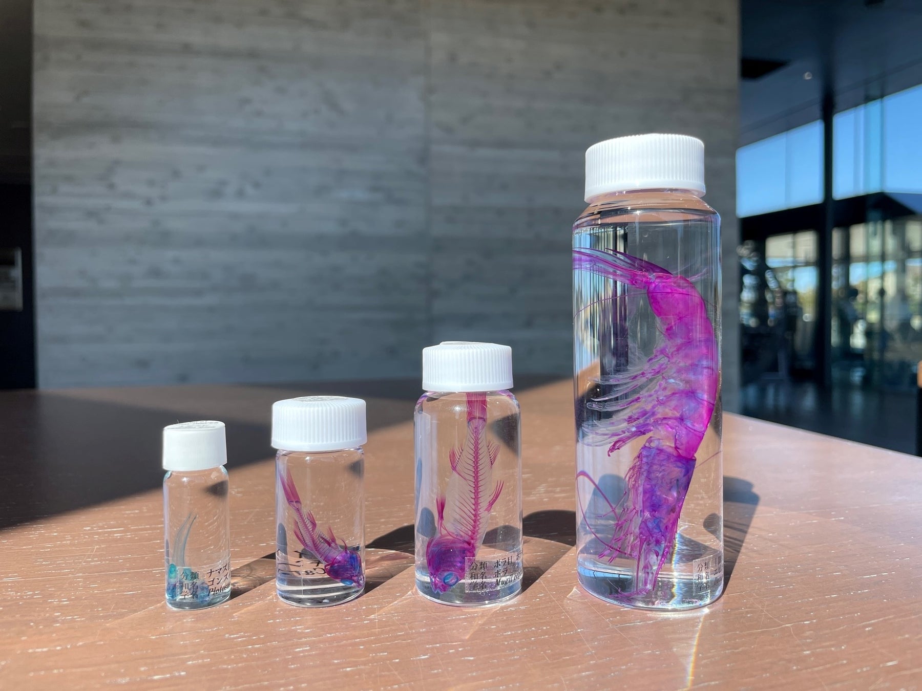 乾燥標本や液浸標本、骨格標本、はく製などさまざまな保存方法がある中、透明標本は「生物の硬骨を赤く、軟骨を青く染色し、タンパク質を酵素や薬品により分解、筋肉を透明化する」という骨格研究の手法を応用した標本です。骨格を立体的に観察できる「標本」としてだけでなく、2色で繊細に色分けされた美しい様子を「アート」として楽しめるのも特徴です。