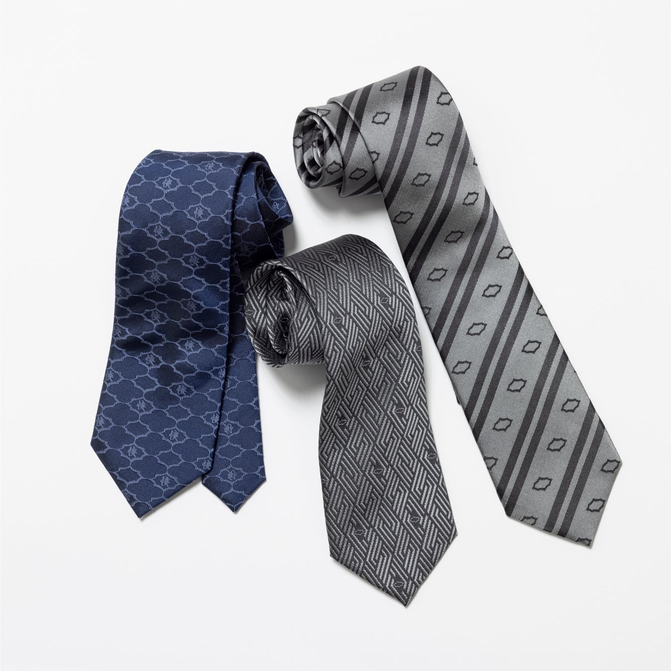 ネクタイは、劇中に登場する役ごとに製作しており、『侠和会』の代紋がパターンに落とし込まれています。全10種での展開となり、氷室蓮司モデルのみ3種類をご用意し、他7人の登場人物ごとに1種類ずつ製作しました。