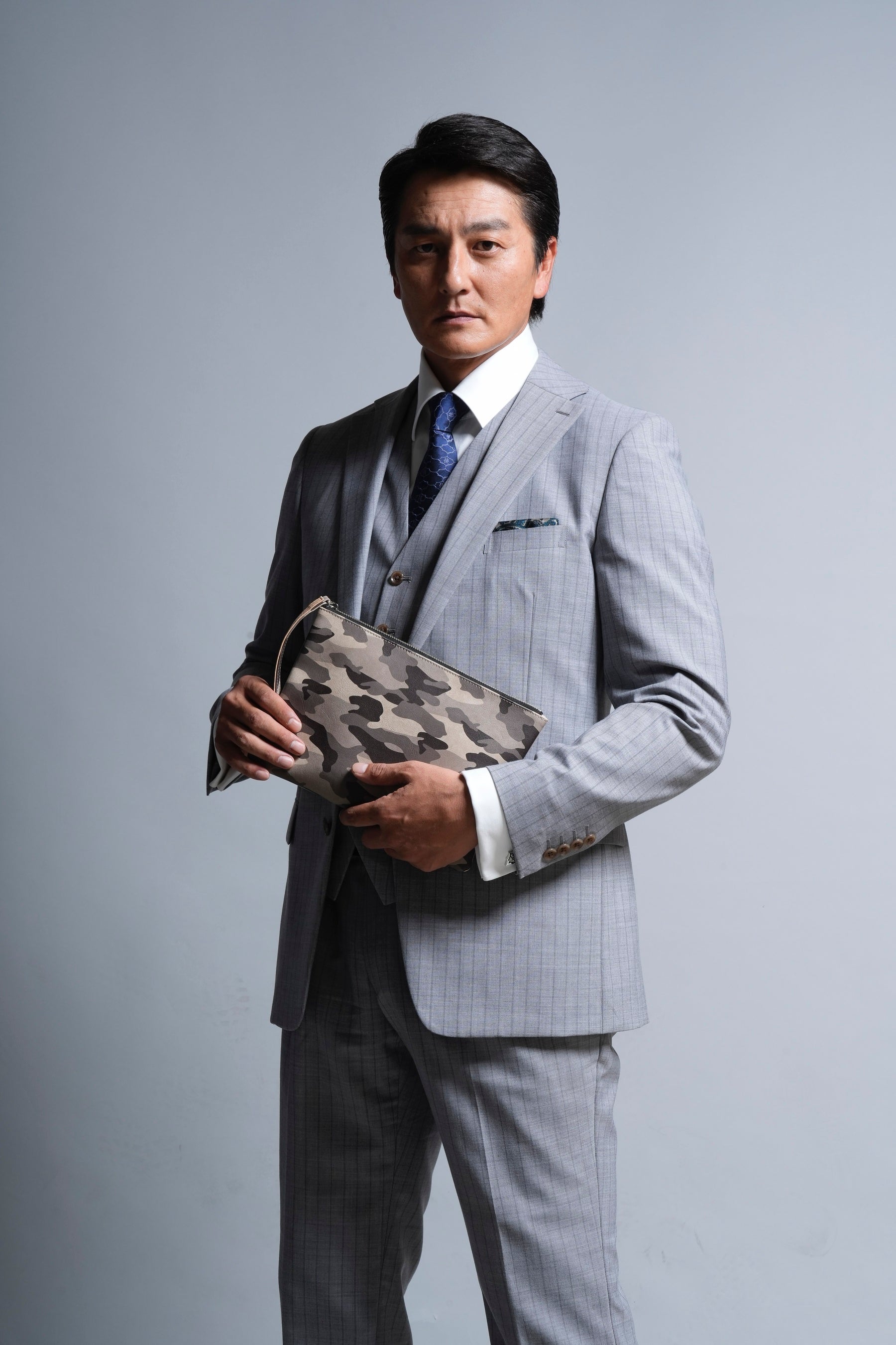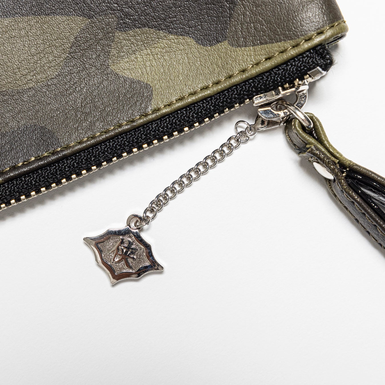 クラッチバックは全3種ご用意し、片面に3種の異なった迷彩柄を落とし込み、もう片面にはそれぞれクロコダイル柄やスネーク柄の組み合わせで、両面使用できるクラッチバックで製作しました。同素材の持ち手と引手部分には、『侠和会』の代紋のチャームが付いており、裏地は代紋の総柄となっています。