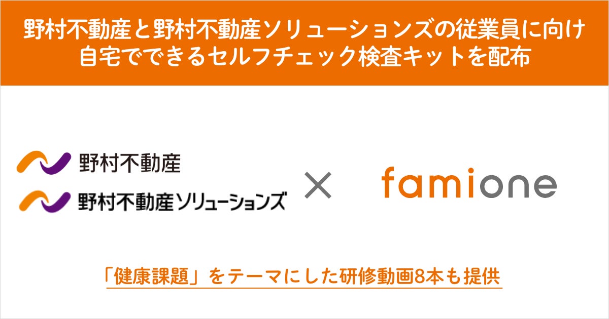 「子どもを願うすべての人によりそい 幸せな人生を歩める社会をつくる」をビジョンに掲げ、法人の従業員向け福利厚生や自治体の住民向け支援を行うヘルスケアサポートサービス「ファミワン」 https://famione.com/benefit/などを展開する株式会社ファミワン(本社:東京都渋谷区、代表取締役:石川勇介)は、野村不動産株式会社(本社:東京都新宿区/代表取締役社長 松尾 大作 以下、野村不動産)と野村不動産ソリューションズ株式会社(本社:東京都新宿区/代表取締役社長 前田 研一、以下、野村不動産ソリューションズ)の従業員向けに、自宅でできるセルフチェック検査キット(精液検査キット・AMH検査キット)を配布し、合わせて「健康課題」をテーマにした研修動画を8本提供いたします。