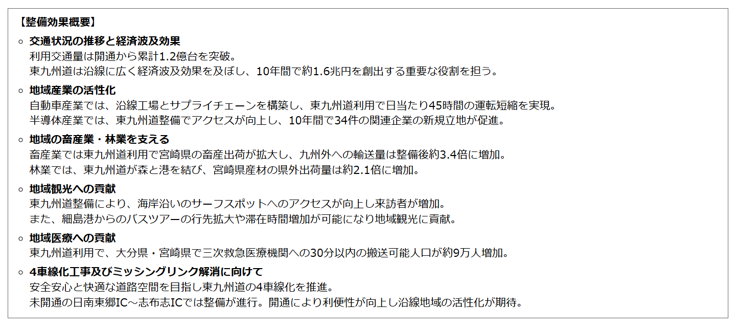 E10 東九州自動車道は、地域産業の活性化や観光動向の変化、地域医療への貢献などの整備効果を生み出し、沿線地域の経済・暮らしを支えています。