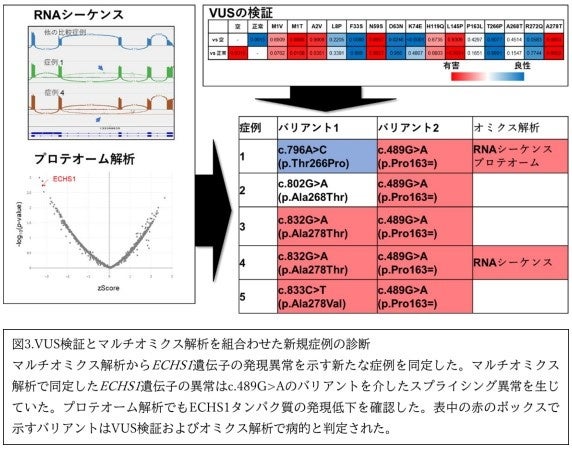 上記の方法によりVUS検証を行ってきましたが、それとは並行してマルチオミクス解析による診断にも取り組んできました(過去のプレスリリース[参考1])。この解析からECHS1遺伝子のRNA発現およびタンパク質の発現低下を示す症例を見出しました(図3、症例1と4)。c.489G>Aのバリアントがスプライシング異常を介して、遺伝子発現に影響することを明らかにしました。さらに、これらの症例ではc.489G>Aの他に、図2で検証したバリアントも持っていました。つまり、先に検証を行っていたことで、迅速に病的なバリアントとして判定することができました。これに関連したバリアントを、過去のゲノム解析データの中から検索したところ、さらなる症例の発見に繋がりました(図3、症例2と3、4)。