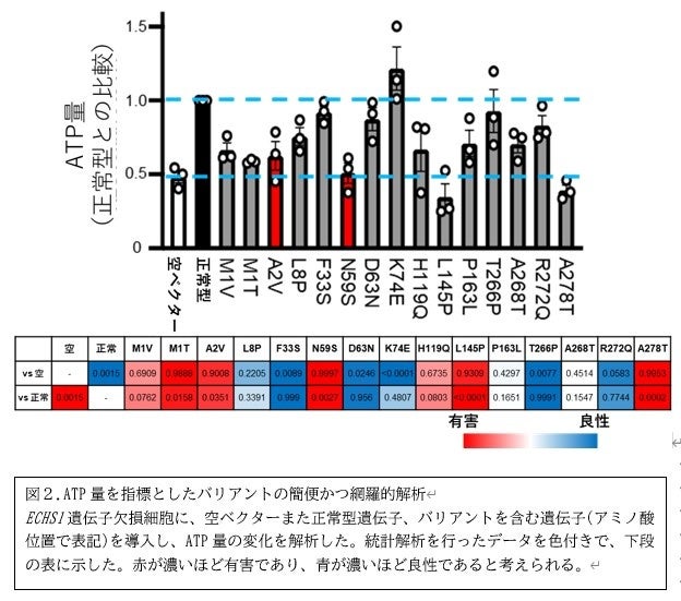 今回、ミトコンドリア病の一種であるLeigh症候群(*8)等の原因となるECHS1(*9)遺伝子を対象にして、VUSの検証を行いました。過去のゲノム解析から同定された病的バリアントあるいはVUSを対象としました。さらに我々は東北メディカルメガバンク(*10)に登録されていた健常者由来のレアバリアント(ただしヘテロ接合状態)も検証の対象としました(図1)。まず、研究材料として、ECHS1遺伝子を欠損させた細胞を作製しました。その細胞に対して、正常なECHS1遺伝子を含む遺伝子発現ベクターを導入しました。簡便な評価方法としてATP量の測定を指標とし、正常なECHS1遺伝子がATP量の回復を示すことを確認しました。さらに、既知の病的バリアントあるいはVUSを、遺伝子発現ベクターを用いてECHS1遺伝子欠損細胞に導入しました。VUSの遺伝子機能が失われていれば、ATP量の回復がされないはずです。この検証によって、これまでにVUSとして留まっていたバリアントの機能的意義を決定し、いくつかのバリアントに関しては病的と判定することができました(図2)。東北メディカルメガバンクに登録されていたバリアントにおいても機能喪失を示す結果を得たため、病気の発症に関与する可能性が示唆されました。