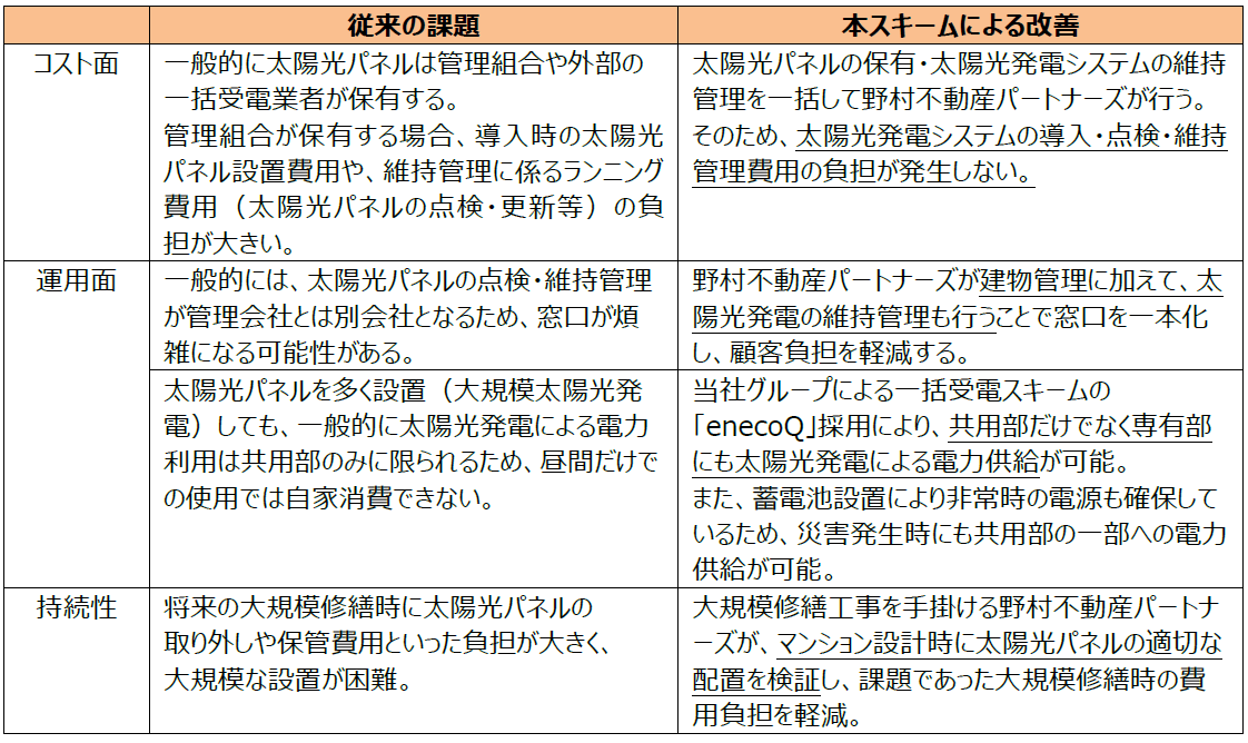 このたび取組むスキームでは、野村不動産のマンション設計段階から野村不動産パートナーズが連携し、野村不動産パートナーズが長年の管理実績から培ったノウハウをもとに、適切な太陽光パネルの配置検討・保有、導入後の維持・管理を一括して行うことで、マンション購入者である顧客の負担を軽減し、太陽光発電の効果最大化を図ります。