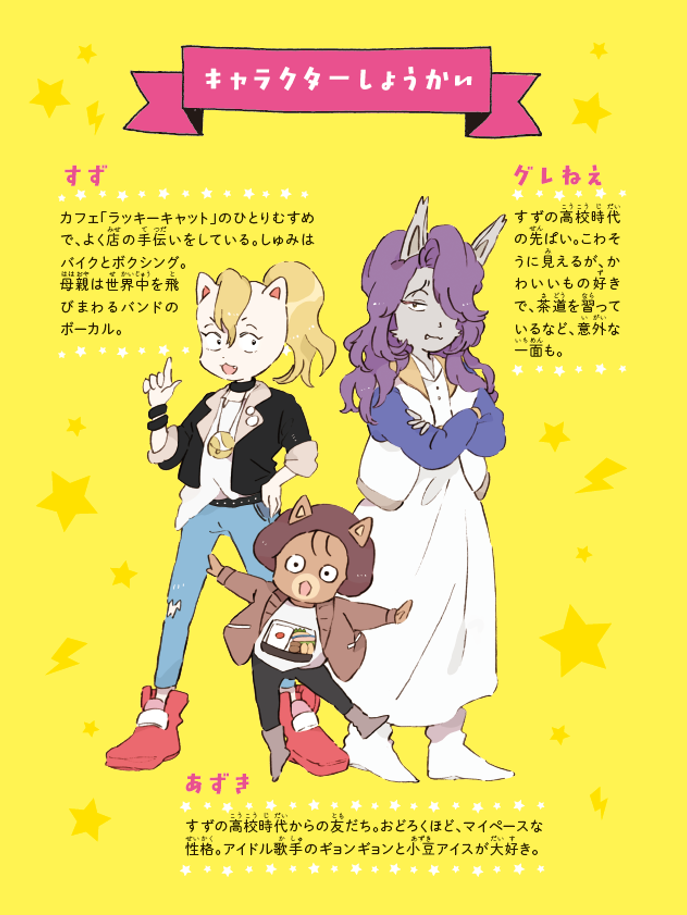 主人公は、おしりたんていシリーズに登場するカフェ・ラッキーキャットのひとり娘・すず。親友2人とルームシェアをしながら自分のやりたいことを探す、楽しくも自堕落、そして疾走感満点なモラトリアム=またたびデイズを、ぜひこの機会にご堪能ください。