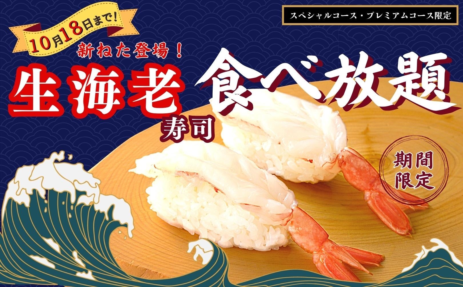 この度、『ザ ブッフェ ニューマーケット』などの10店舗では、2023年9月7日(木)~ 2023年10月18日(水)のスペシャルコース以上のご利用にて、価格はそのまま!寿司食べ放題にぷりぷりの食感と口の中で広がる甘みと旨みがたまらない『生海老寿司』が食べ放題で登場いたします!