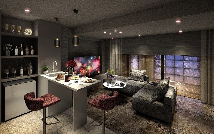 バーカウンターや、大型モニターを備えたアッパーラウンジでは、大人の隠れ家の様な落ち着いた雰囲気で、ゆったりとくつろぎの時を過ごすことができます。