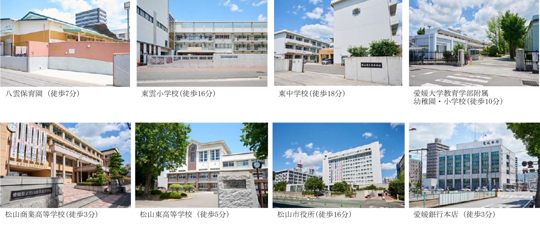 松山屈指の2つのアーケード商店街、「大街道商店街」「松山銀天街商店街」を日常利用することができ、日々の買い物、休日の楽しみ等、街の賑わいを感じられます。一方、住環境は、南側に松山商業高校、北側には愛媛県知事公舎(徒歩1分)が建つ住宅街で、その他教育施設も集積し、街の喧騒から離れた落ち着いた環境が整っています。