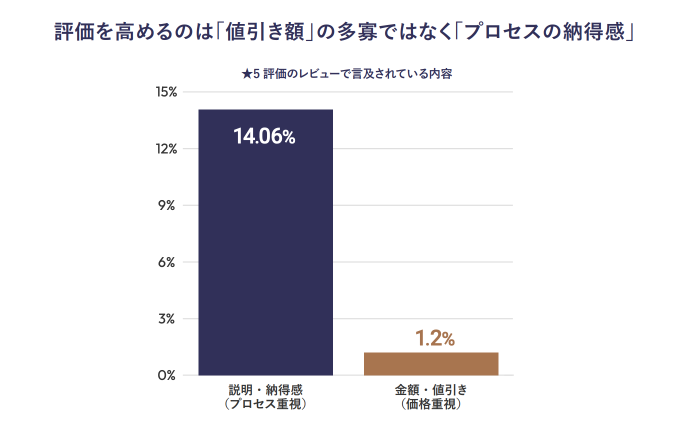 クチコミを分析した結果、値引き額の多さやハード面(設備・性能)の充実以上に、プロセスへの納得感やスタッフの対応力といった「ソフト面」が店舗の評価を大きく左右していることが判明しました。