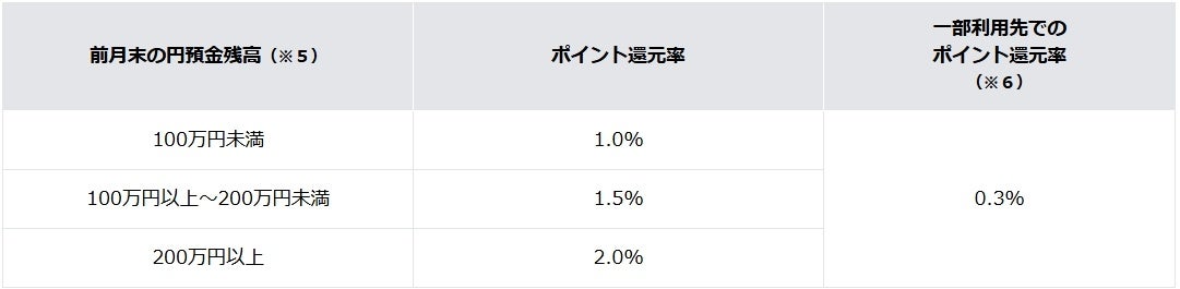 デビット利用月の前月末の円預金残高に応じて、デビットカードの利用額※4に対して最大2%のカテエネポイントを還元いたします。