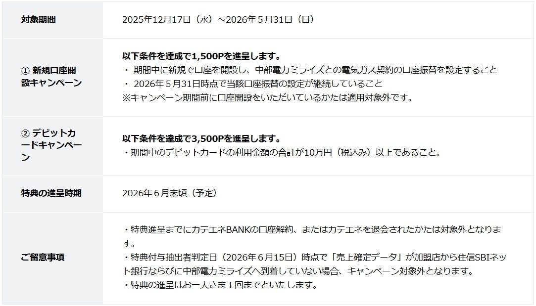 - お客さまの不正行為により、住信SBIネット銀行および中部電力ミライズがキャンペーン対象外と判断した場合