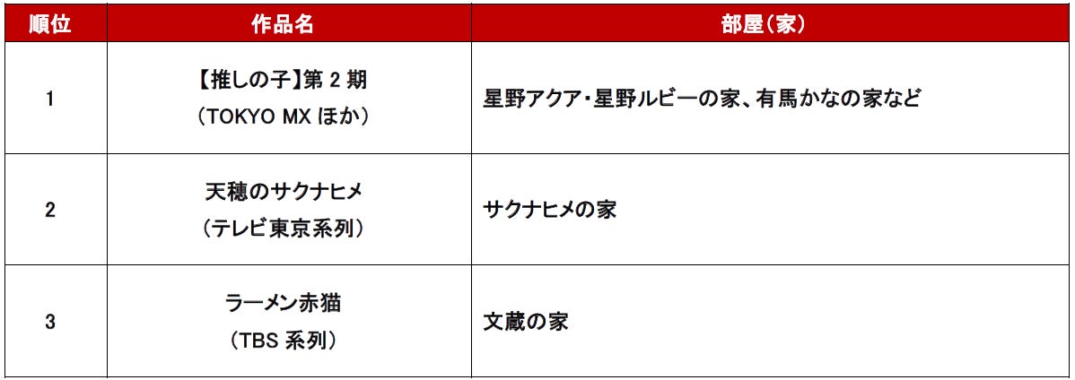 2024年7月以降に放送されたテレビアニメの中で、“住んでみたい”と思った部屋(家)が出てきたテレビアニメ1位は「【推しの子】第2期」でした。主人公の星野アクア・星野ルビーの家の他、有馬かなの家にも票が集まりました。選んだ理由を聞いたところ、「間取りが良い(星野アクア・星野ルビーの家)」「リッチなマンションでセキュリティーも安心(有馬かなの家)」という声が上がりました。