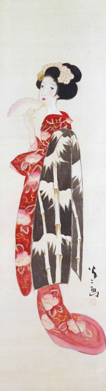 蔵を改装した展示室では、雪合戦をするこどもたちが愛らしい《雪だるま》や、椿の柄のきものを着た女性を描いた《満願の日》などを展示。