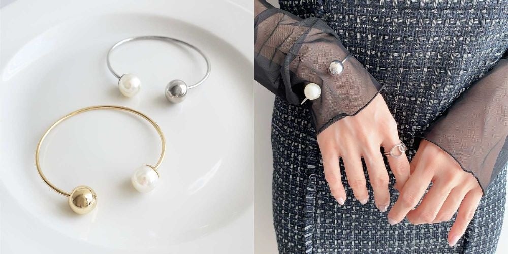 パールとメタルを合わせたシンプルデザインで、カジュアルコーデにも合わせやすいバングル。