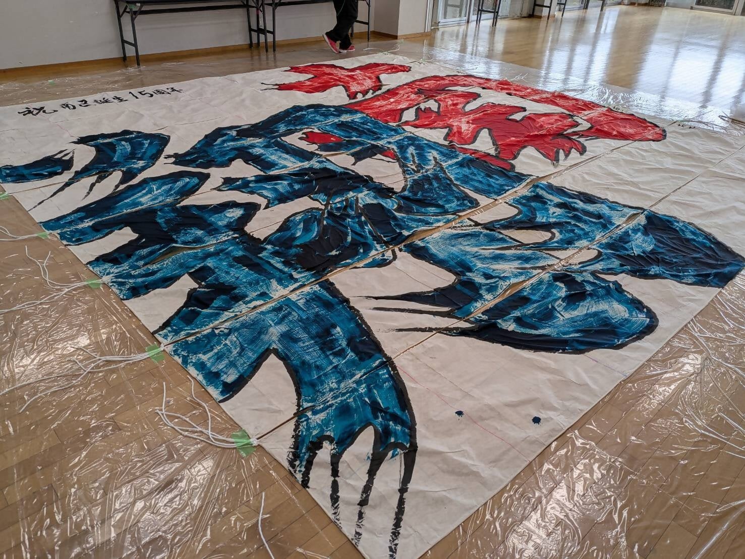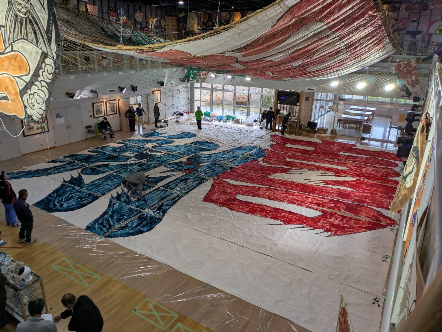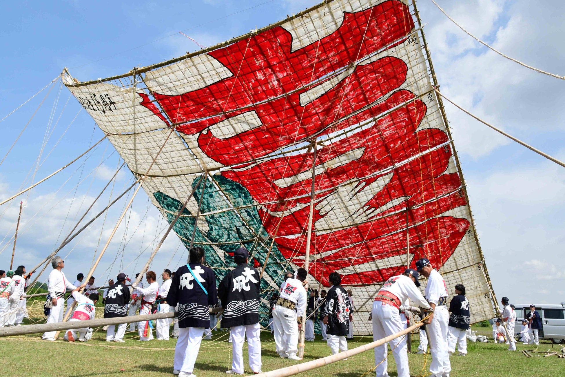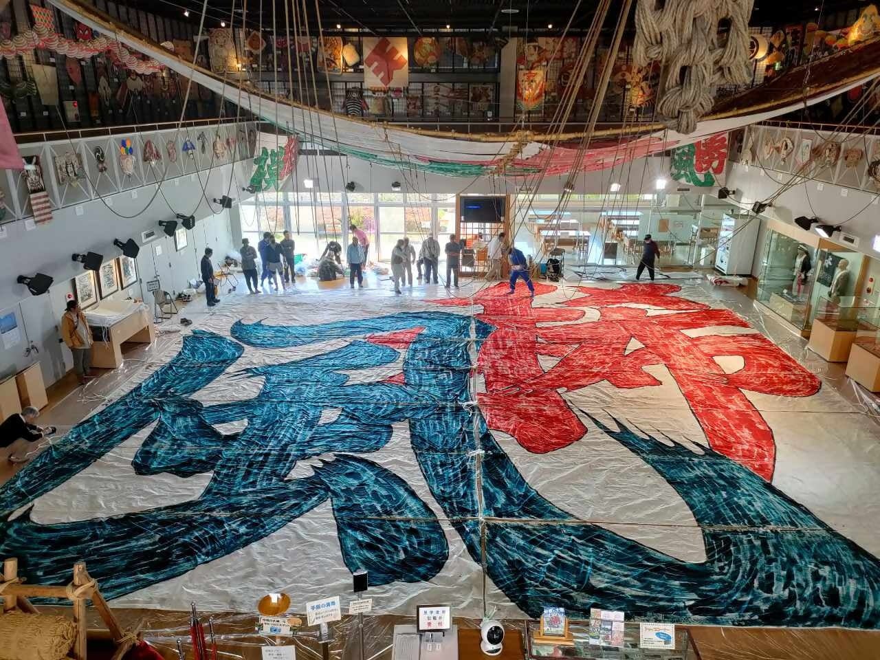 一般的に、凧には絵や文字が描かれますが、「相模の大凧」では、その時々の世相を反映した漢字2文字が大凧の題字として書かれ、一文字目は太陽の赤、二文字目は大地の緑で表現されます。