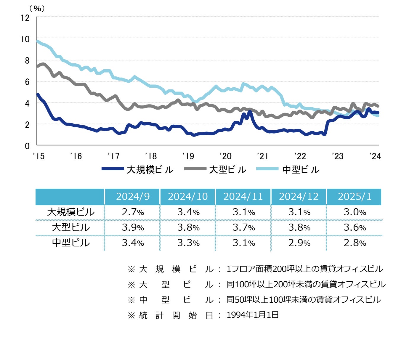 募集賃料は前月比マイナス21円/坪の12,581円/坪となった。前月から下落したもののわずかな動きに止まり、募集賃料は12,000円/坪台半ばの水準を維持している。