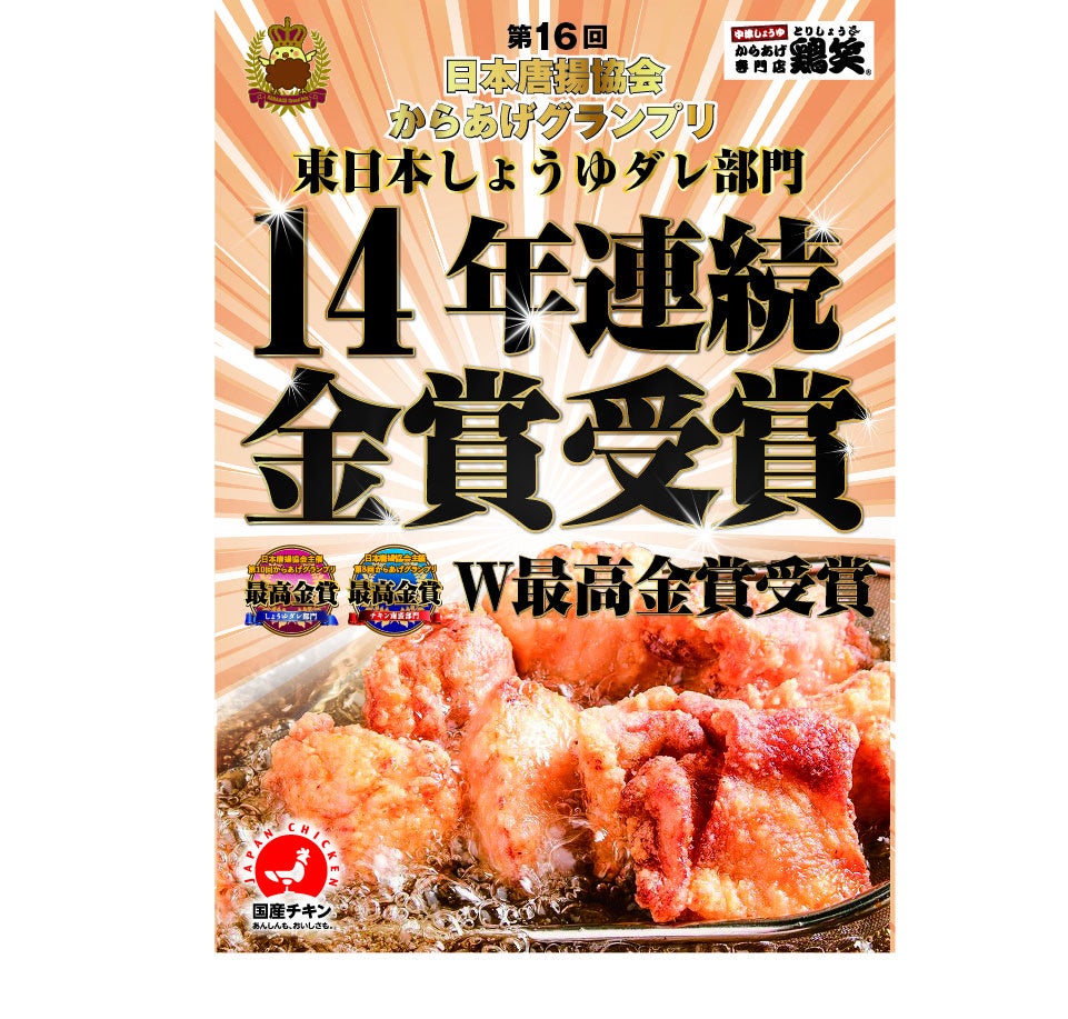 【鶏笑】「第16回からあげグランプリ®」東日本しょうゆダレ部門でからあげ専門店 鶏笑(とりしょう)が14年連続金賞を受賞