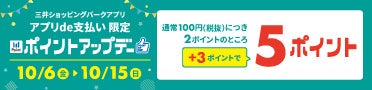 期間中、三井ショッピングパークアプリのスマホ決済『アプリ de 支払い』をご利用してお買物いただくと、通常100円(税抜)につき2ポイントのところ、+3ポイントの計5ポイントがもらえるキャンペーンを開催いたします。