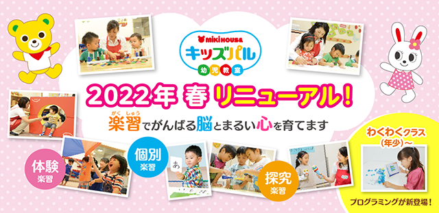 全国の百貨店で展開中の0歳10ヵ月からの幼児教室「ミキハウスキッズパル」を運営する、株式会社小学館集英社プロダクション(本社:東京都千代田区、代表取締役社長:都築 伸一郎)は、全国の百貨店で約50教室を展開中の幼児教室「ミキハウスキッズパル」において、2022年3月よりサービスリニューアルを実施いたします。