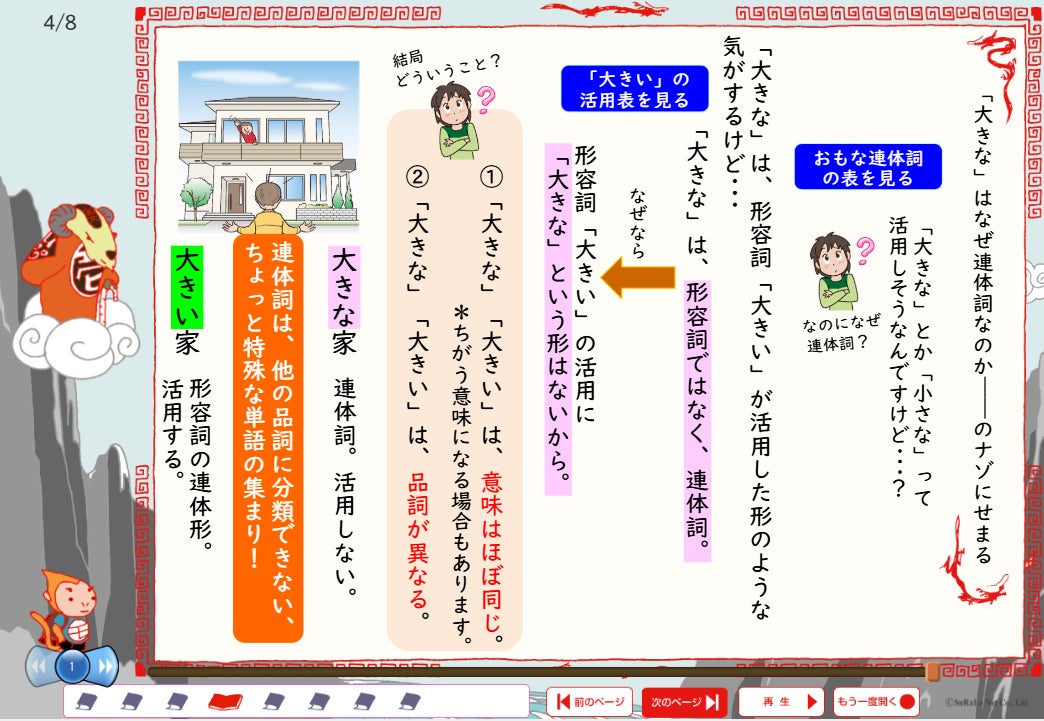 国文法は興味を持ちにくく、苦手意識を抱く生徒が多いと言われています。そこで「すらら」の国文法では、生徒が疑問を抱きやすい「ら抜き言葉」や、「大きい」は形容詞なのに「大きな」は連体詞なのかといったテーマを丁寧に解説。「自分も使っている!」「そういうことか!」と日本語の不思議や難しさを楽しく、そして学ぶ喜びを感じられるように工夫しています。