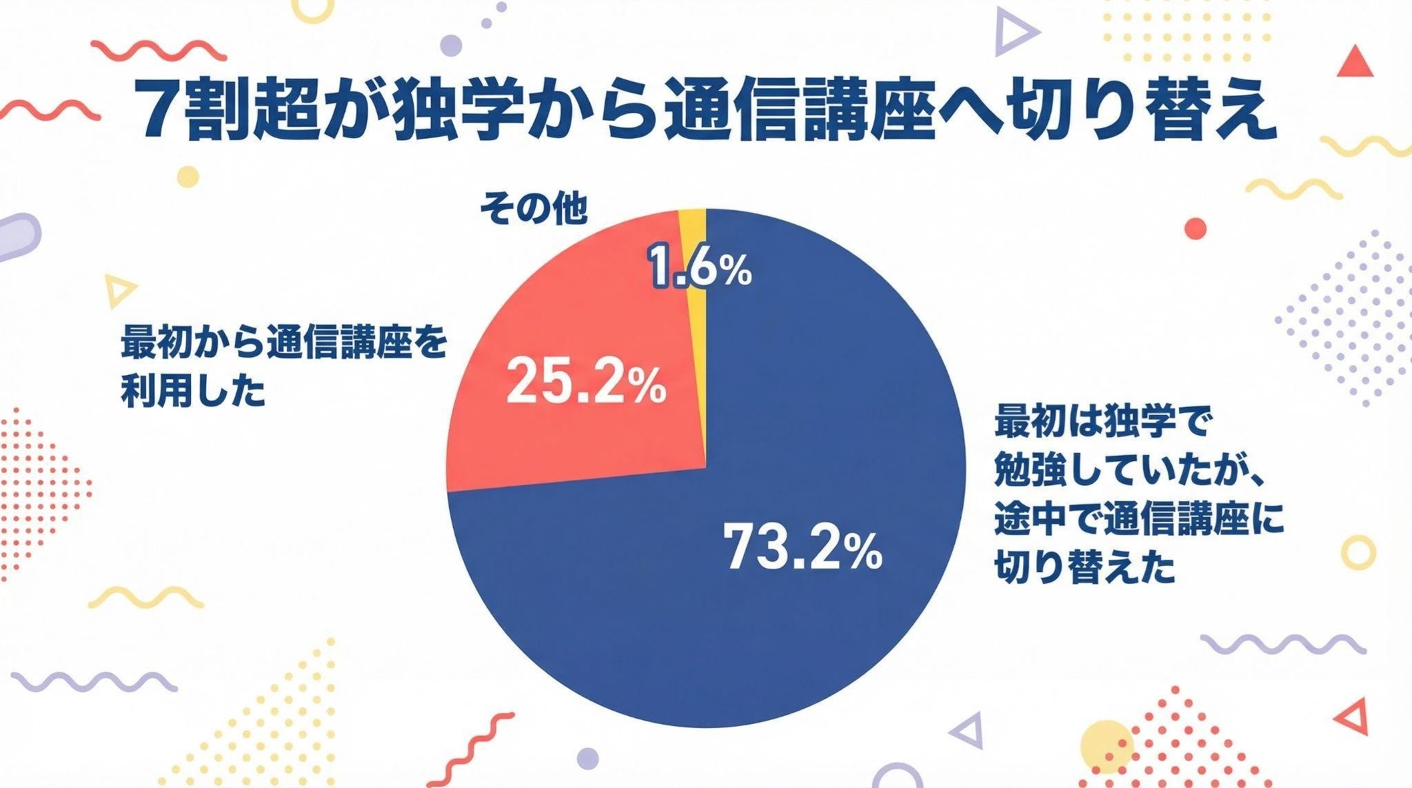 「最初から通信講座を利用した」という25.2%を大きく上回り、多くの合格者が独学の限界を感じて講座利用に踏み切っている実態が明らかになりました。