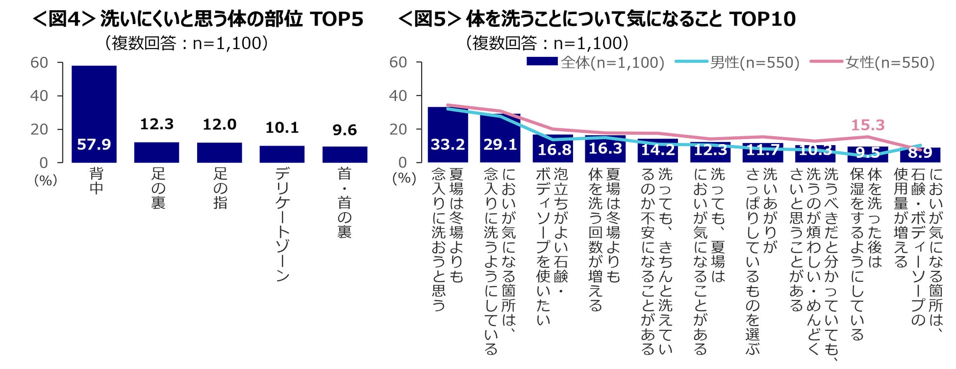 体を洗うことで気になることは「夏場は冬場よりも念入りに洗おうと思う」「においが気になる箇所は、念入りに洗うようにしている」が3割前後で上位。夏場やにおいを気にしている様子がうかがえる。