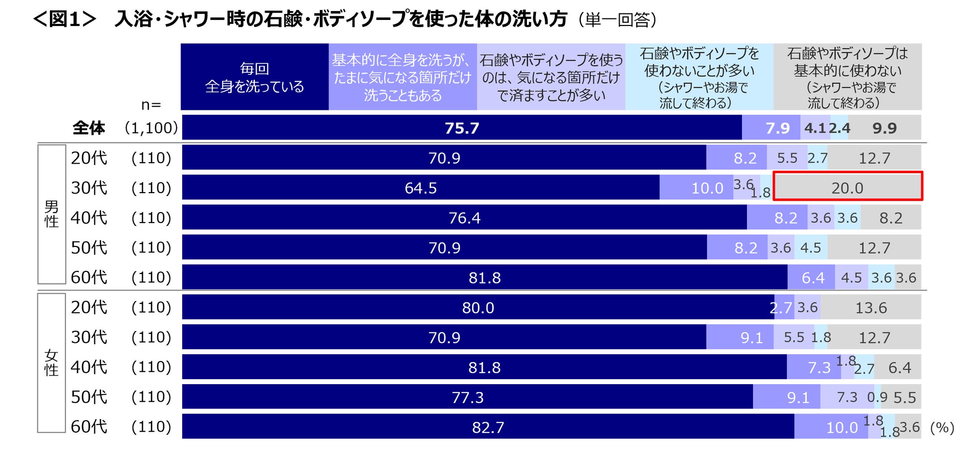入浴・シャワーの際に石鹸やボディソープを使って「毎回全身を洗っている」人は75.7%と多数。一方で、「基本的に使わない」人は9.9%。