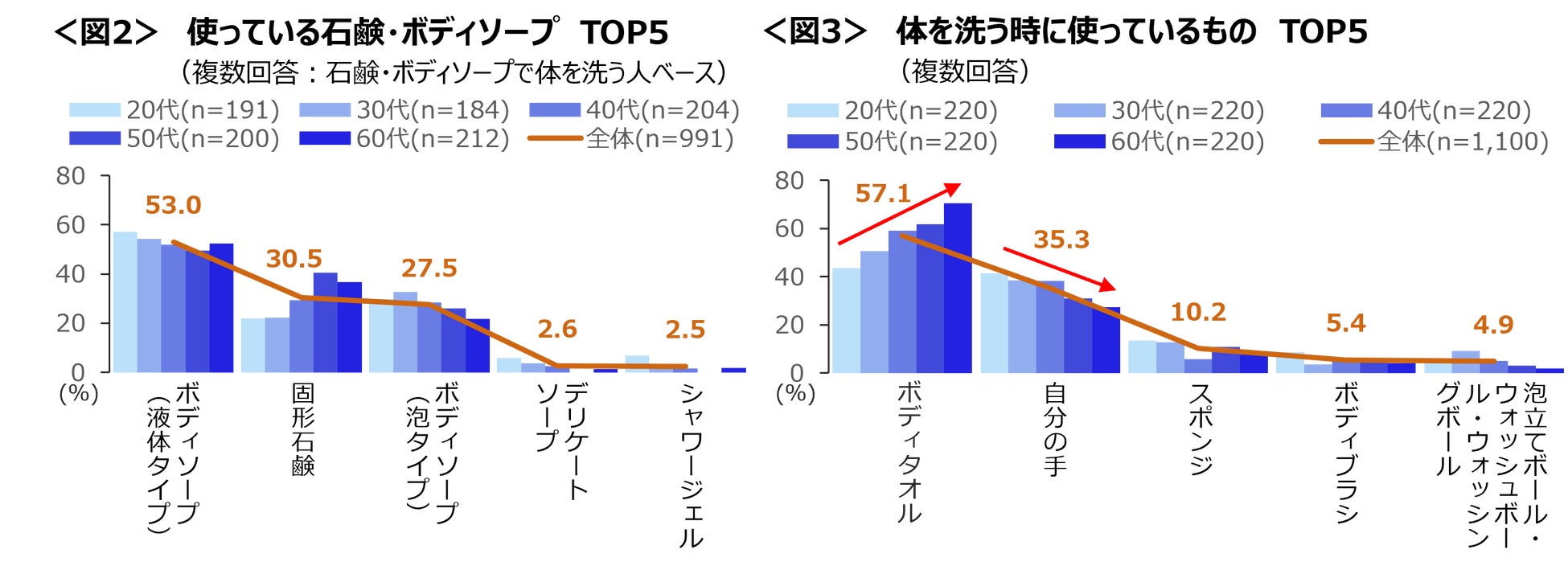 50代・60代で「固形石鹸」を使っている割合が高く4割前後。<図2>