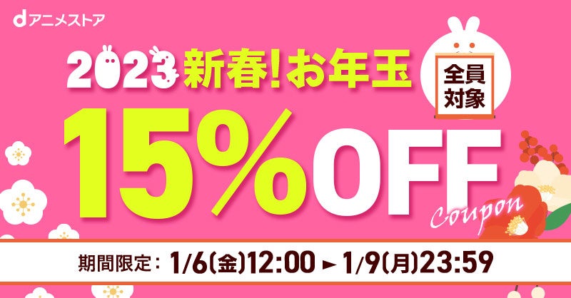 5,000作品以上のアニメが見放題(※)の「dアニメストア」( https://animestore.docomo.ne.jp/ )では、2023年1月6日~1月9日まで「新春!お年玉15%OFFクーポン」を実施します。